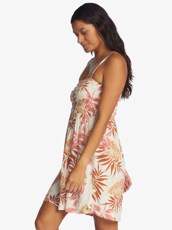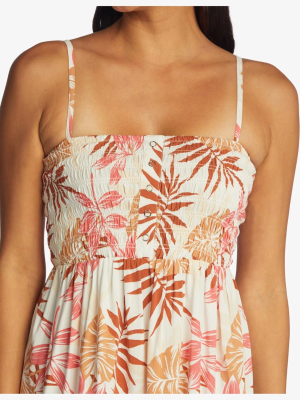 Dream of paradise with this strappy dress featuring a warm-colored tropical print on lightweight viscose fabric. The fitted smocked bodice and straps hug your curves while the flowy skirt twirls under the sun.