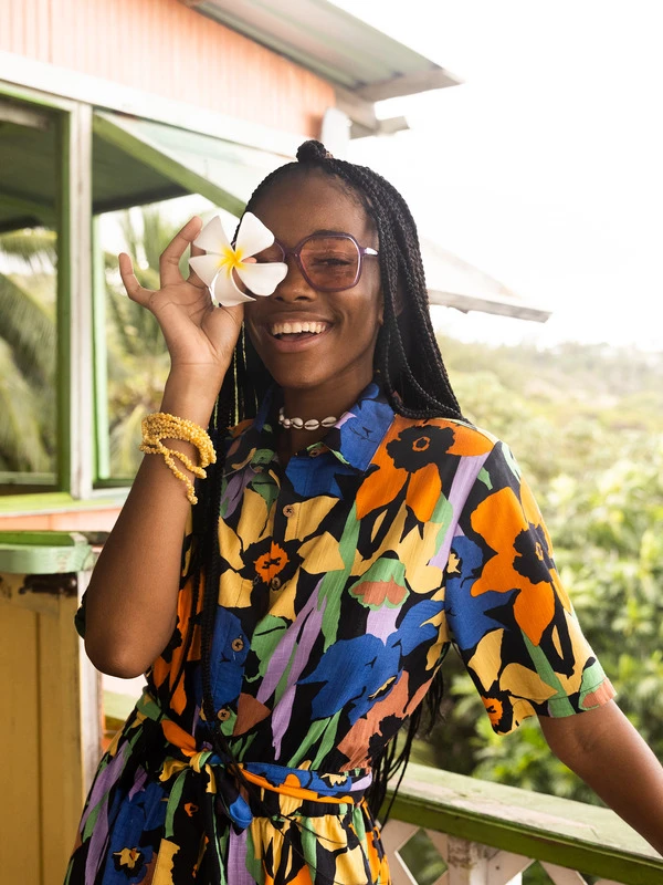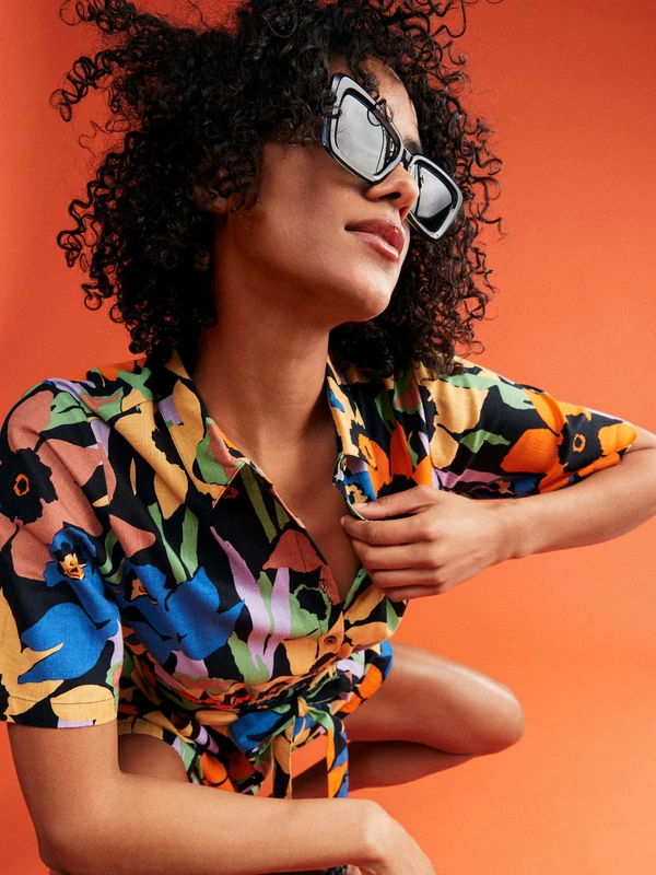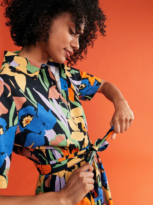 Make a bold statement in this comfy floral romper crafted of mid-weight cotton slub fabric with a knotted belt and elastic waistband to perfectly define your shape.