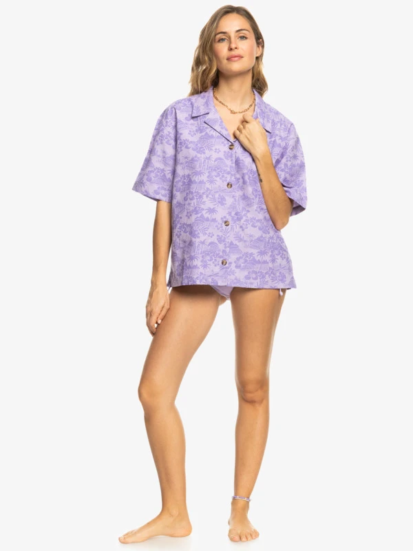 Made in an eco-conscious blend of BCI cotton and linen, the Surf.Kind.Kate button-up short sleeve shirt features an island floral print in lovely lavender and recycled tortoise front buttons. Made to fit loose, pleats at the back yoke add a beautifully tailored touch.